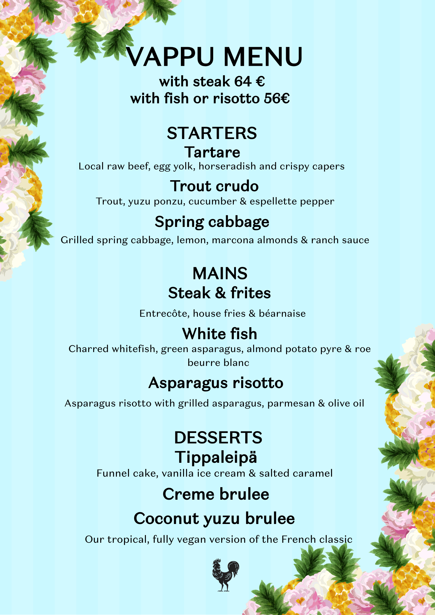 Vappu Eve 30.4.: We are serving lunch 11-14. For the evening kitchen opens at 16. You can pop in just for drink between 14 & 16. We stay open until 00 for the ones who wishes to party late.